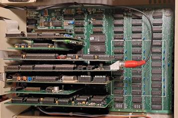 DOS und CP/M booten normal und funktionieren wie erwartet. Dann der Versuch mit ProDos und Apple-Pascal: Absturz, nichts geht mehr. Das linke Bild zeigt die Ausgabe des Apple-II Händler-Diagnose Programms. Verantwortlich für das Fehlverhalten war der rot markierte IC, ein LS7400, im rechten Bild. Er verhinderte die Umschaltung der 4k RAM Banks.